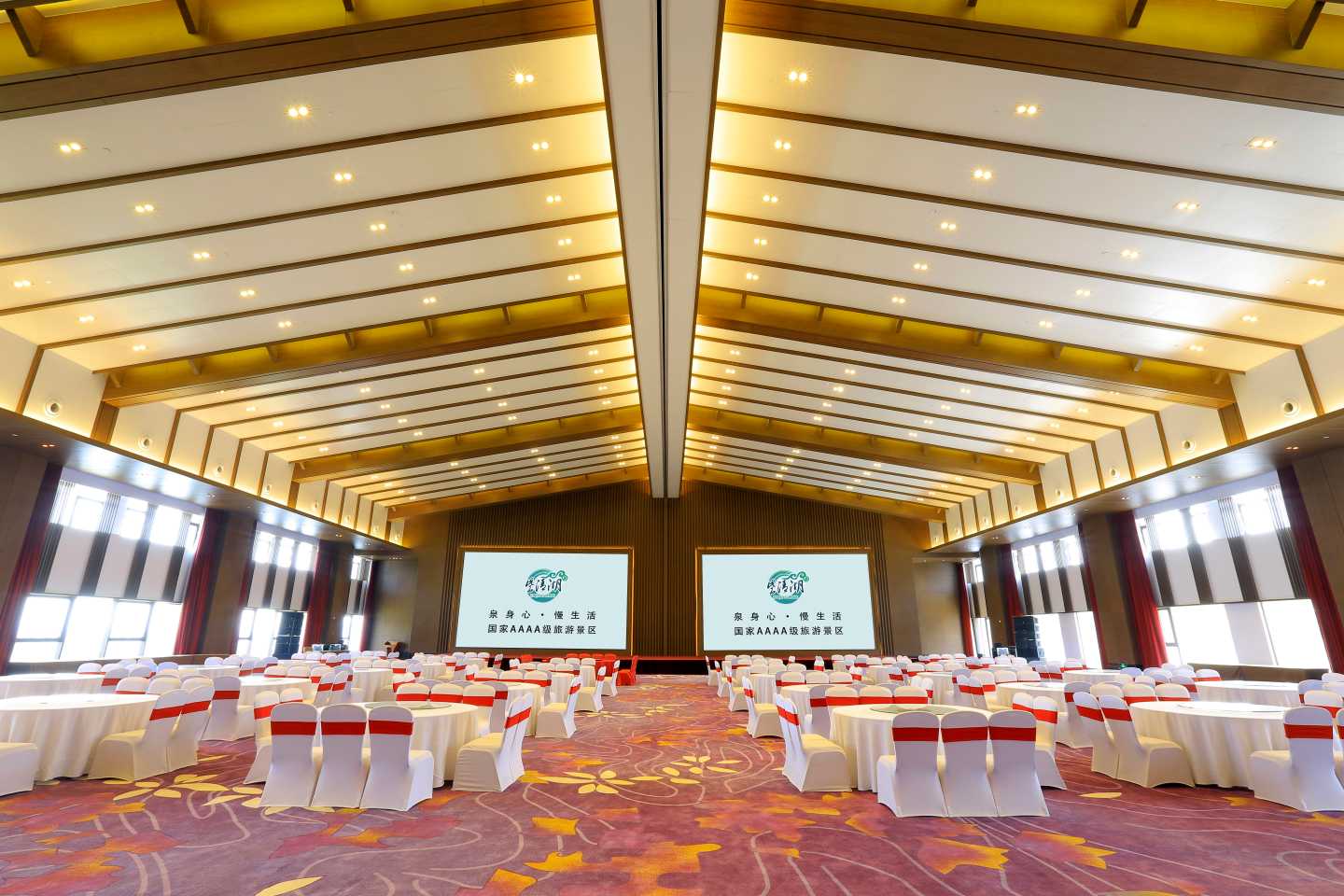 景区拥有大小会议室16间,最大无柱宴会厅约1500㎡、挑高8.8米,可容纳千人同聚,辅以紫清湖千亩自然风光,是举办喜宴、庆典演出、户外草坪婚礼、团队聚会、个人宴请的优选场地。从场地布置到流程安排,从婚纱礼服到宴会餐饮,每一个环节都经过精心打磨与严格把控,为您提供一站管家式宴会统筹服务。