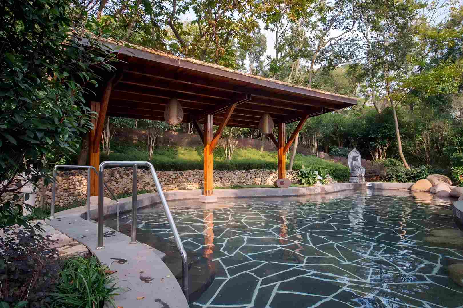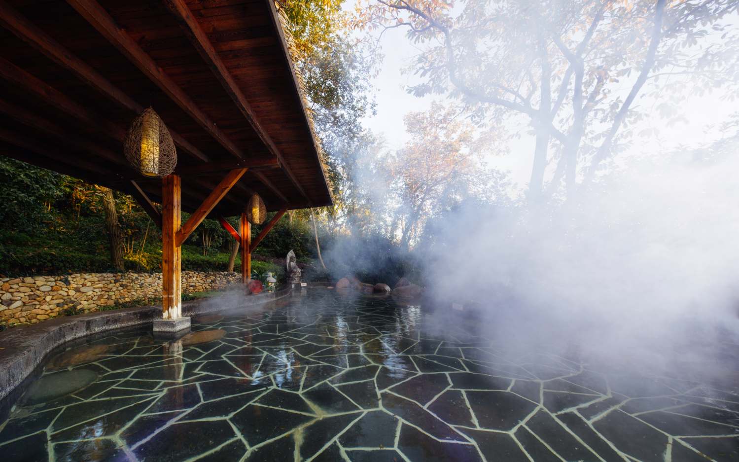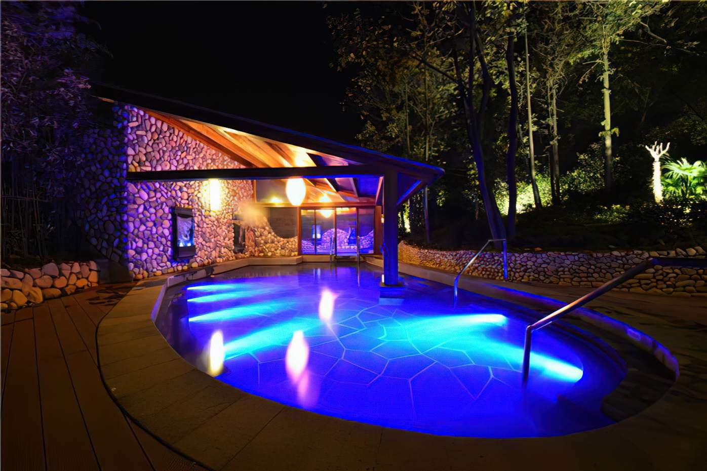 紫清湖森林温泉,引“居中国四大温泉疗养区之首,中国唯一获得欧洲、日本温泉水质国际双认证”的汤山温泉,含硫磺、钙、镁、钾、钠等多种化学物质,有瀑布池、矿砂浴、石板浴及亲亲鱼疗池等 30 种功能形态各异的泡池。温泉依山傍水而建,户外温泉池掩映在郁郁葱葱的森林之中,让泡汤更具私密与放松。